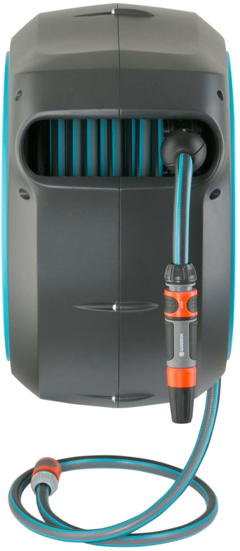 De slangenbox wordt geleverd met alle vereiste aansluitonderdelen: een muurbeugel, een aansluitslang, alle benodigde Original GARDENA System en montageonderdelen en een mondstuk met twee verschillende sproeiopties.